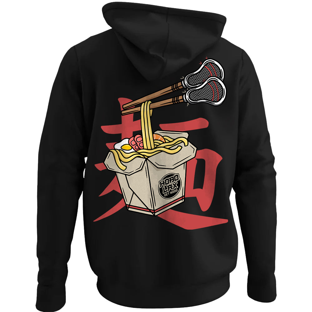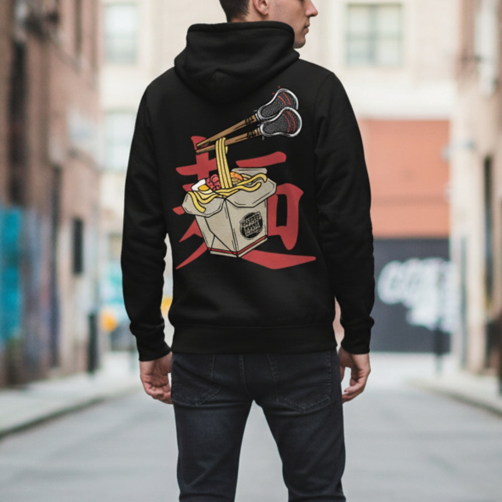 The 'Get Nood' hoodie serves up lacrosse culture with a side of creativity. Perfect for players who appreciate unique designs that go beyond basic lax gear, this hoodie features a ramen box with lacrosse sticks as chopsticks—because why not? It's a simple yet cutting-edge Japanese-inspired design that works as a birthday gift for the laxer in your life, team bonding gear, or just everyday wear for players who want something different.