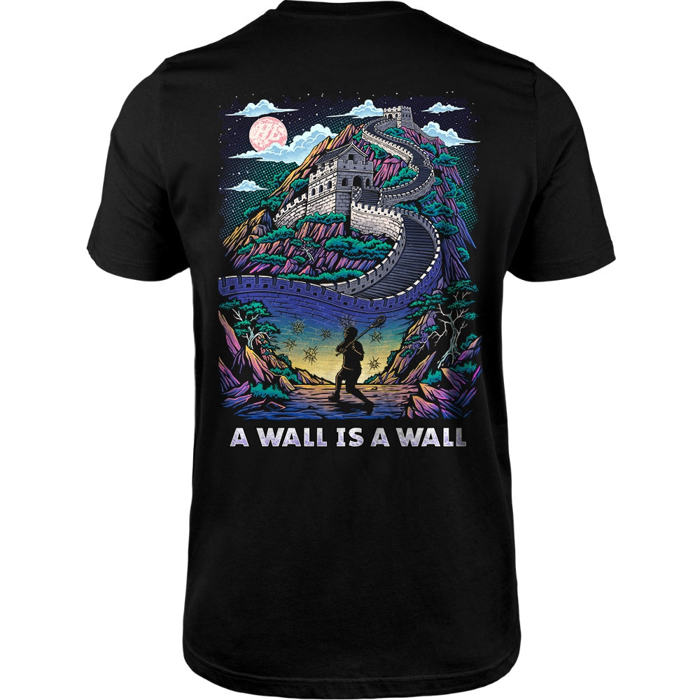 The 'A Wall is a Wall' Tee celebrates the dedication of true wall ball warriors. This bold design reimagines the Great Wall of China with a lax player grinding through reps, featuring eye-catching blues, purples, and greens that pop against the black tee background. For players who know that consistent practice anywhere is the key to stick skills.