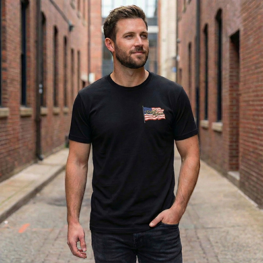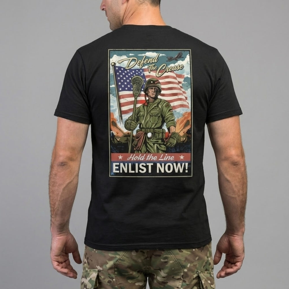 The For Crease & Country Tee draws inspiration from classic WWII-era recruitment posters, putting defensive players in the spotlight they deserve. The battle-ready pole stands tall with pride, weapon raised, embodying the sacred duty of protecting the crease. This isn't just another lax shirt – it's a tribute to the defenders who hold down the fort between the pipes.